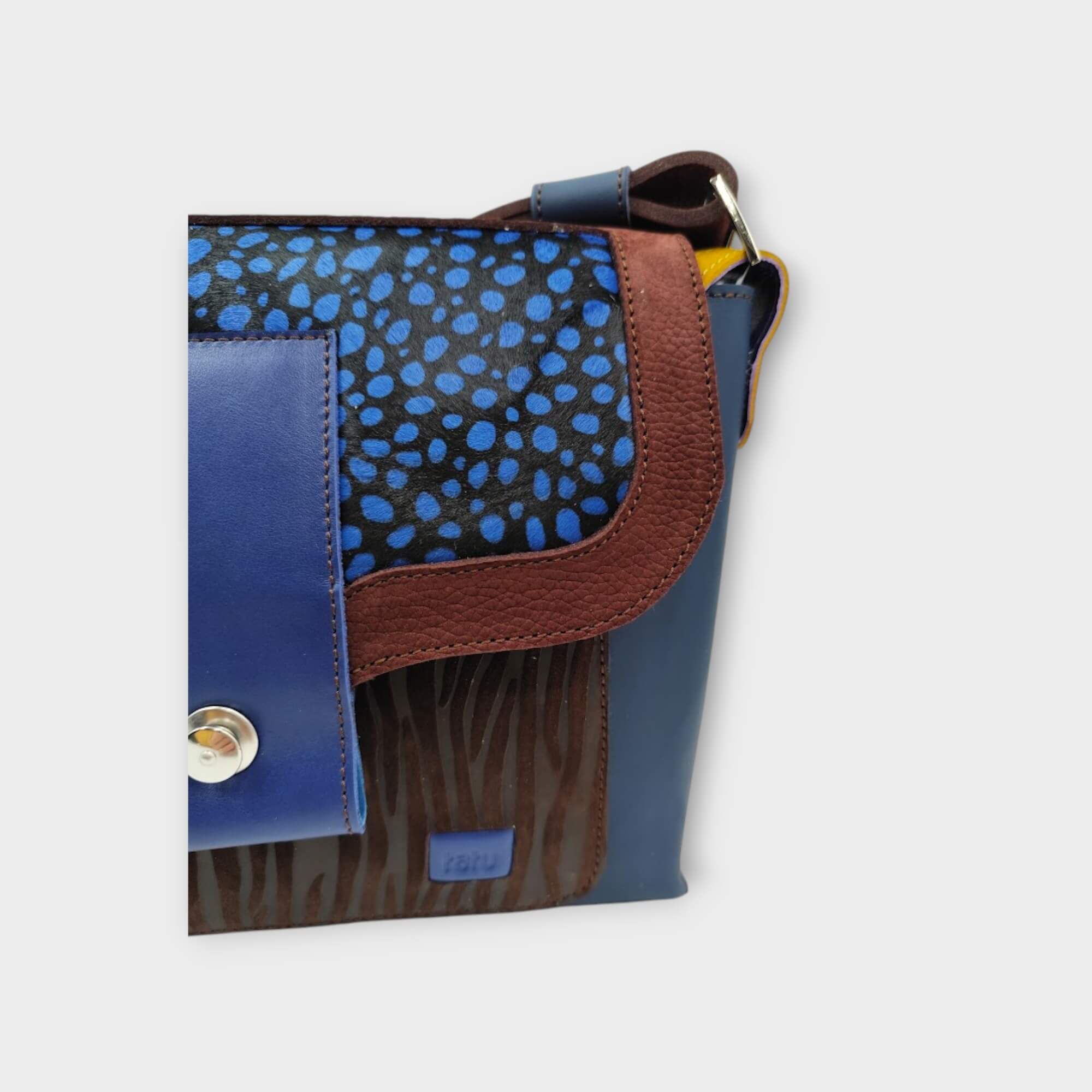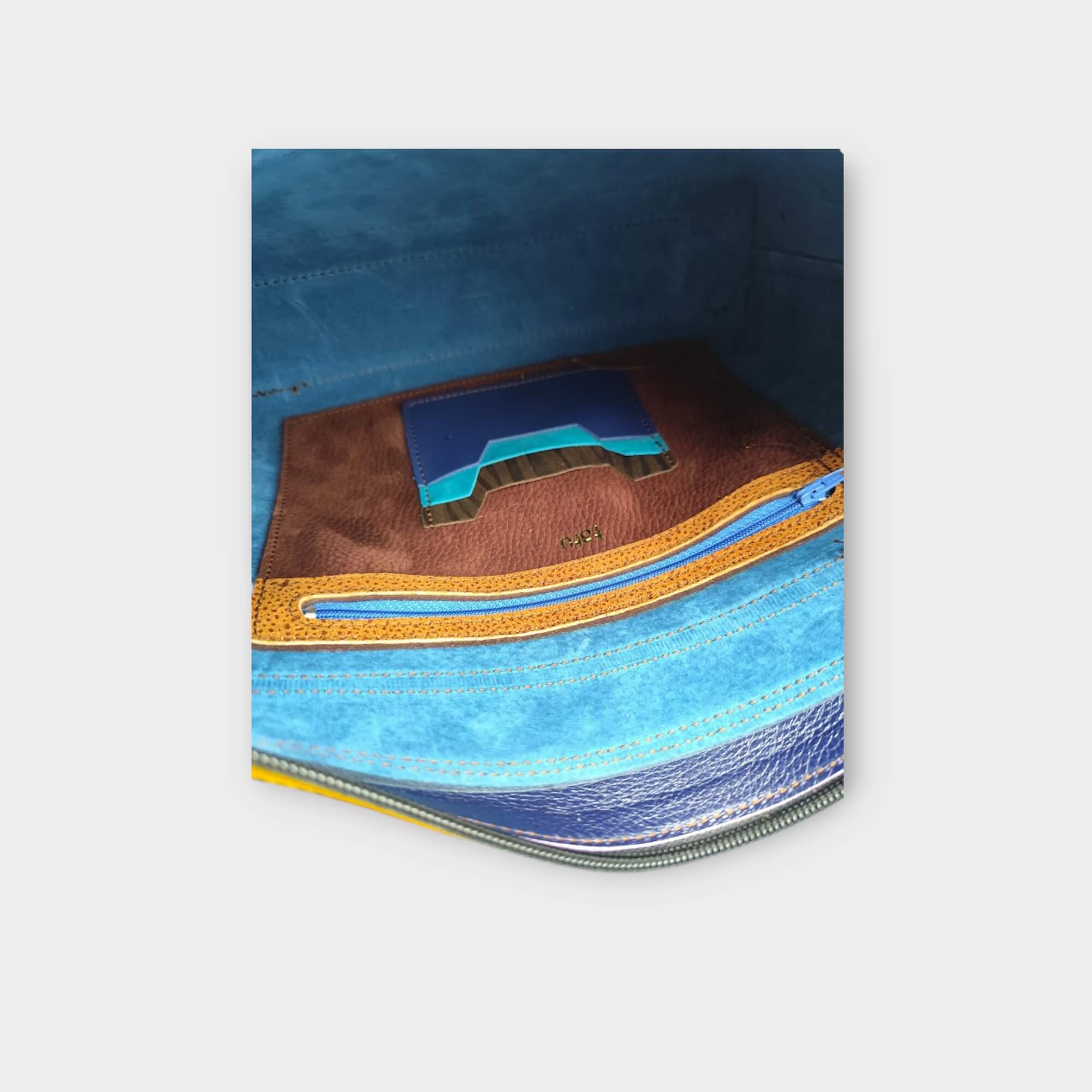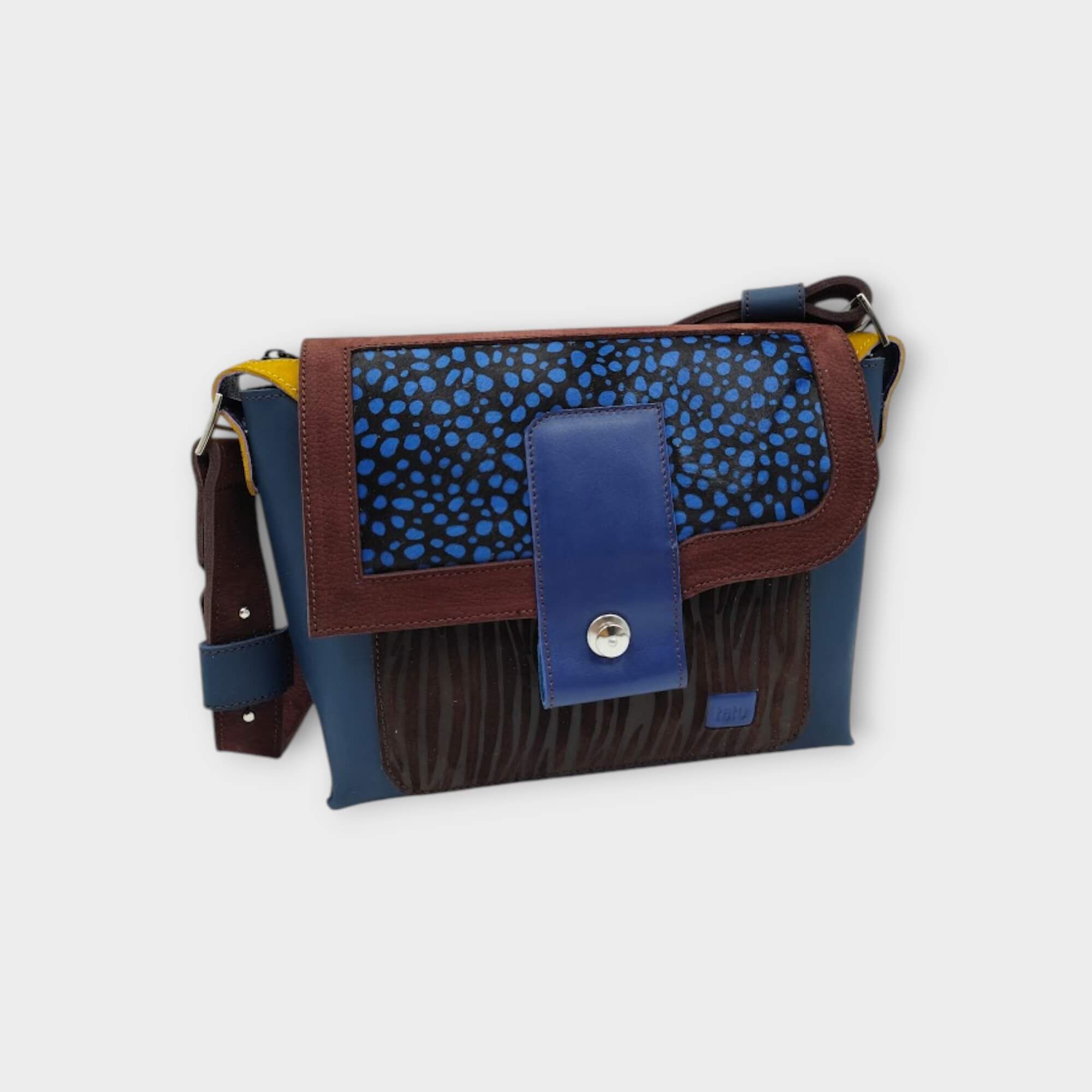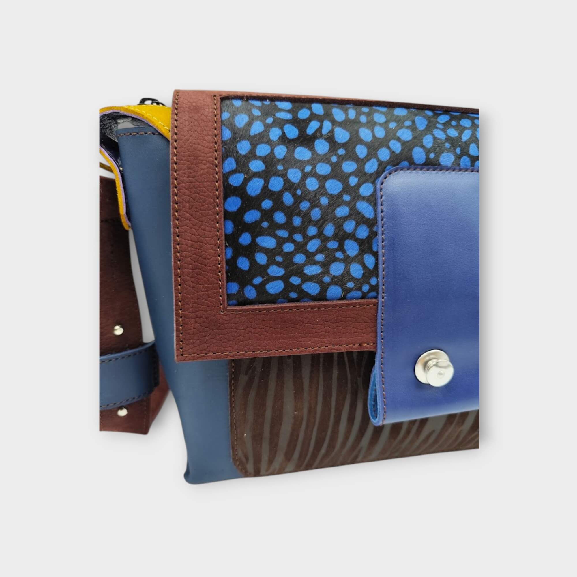 Minden táska az épp aktuális bőrválasztékom és hangulatom által komponált alkotás, sok színből álló vidám, olykor visszafogott színösszeállítás is előfordul. Egyedi egy-egy darabos limitált táskák.