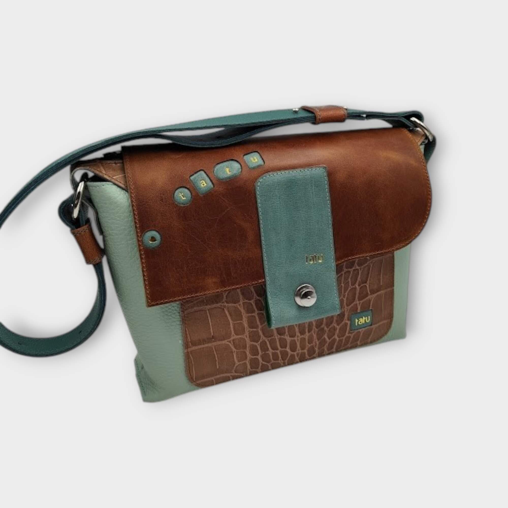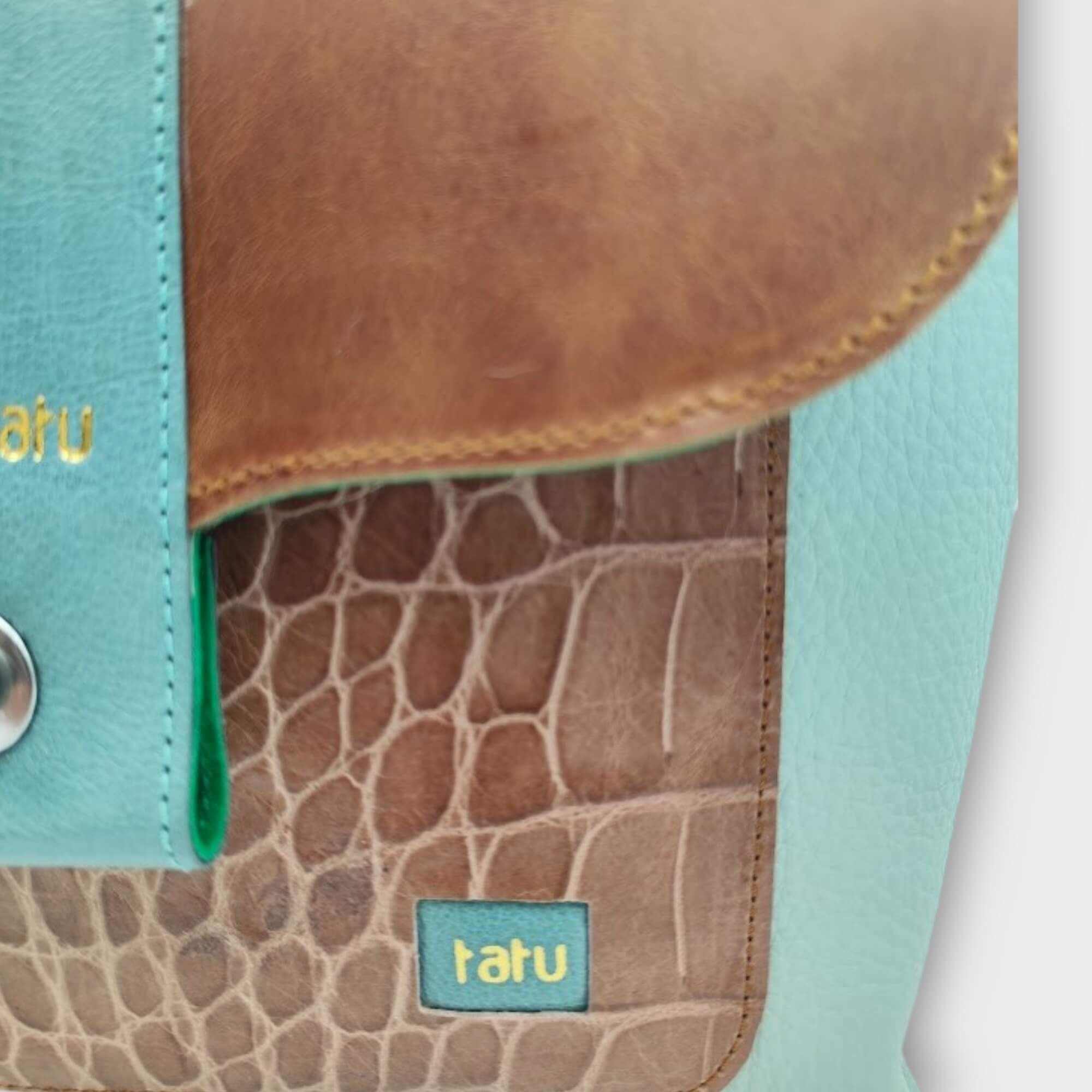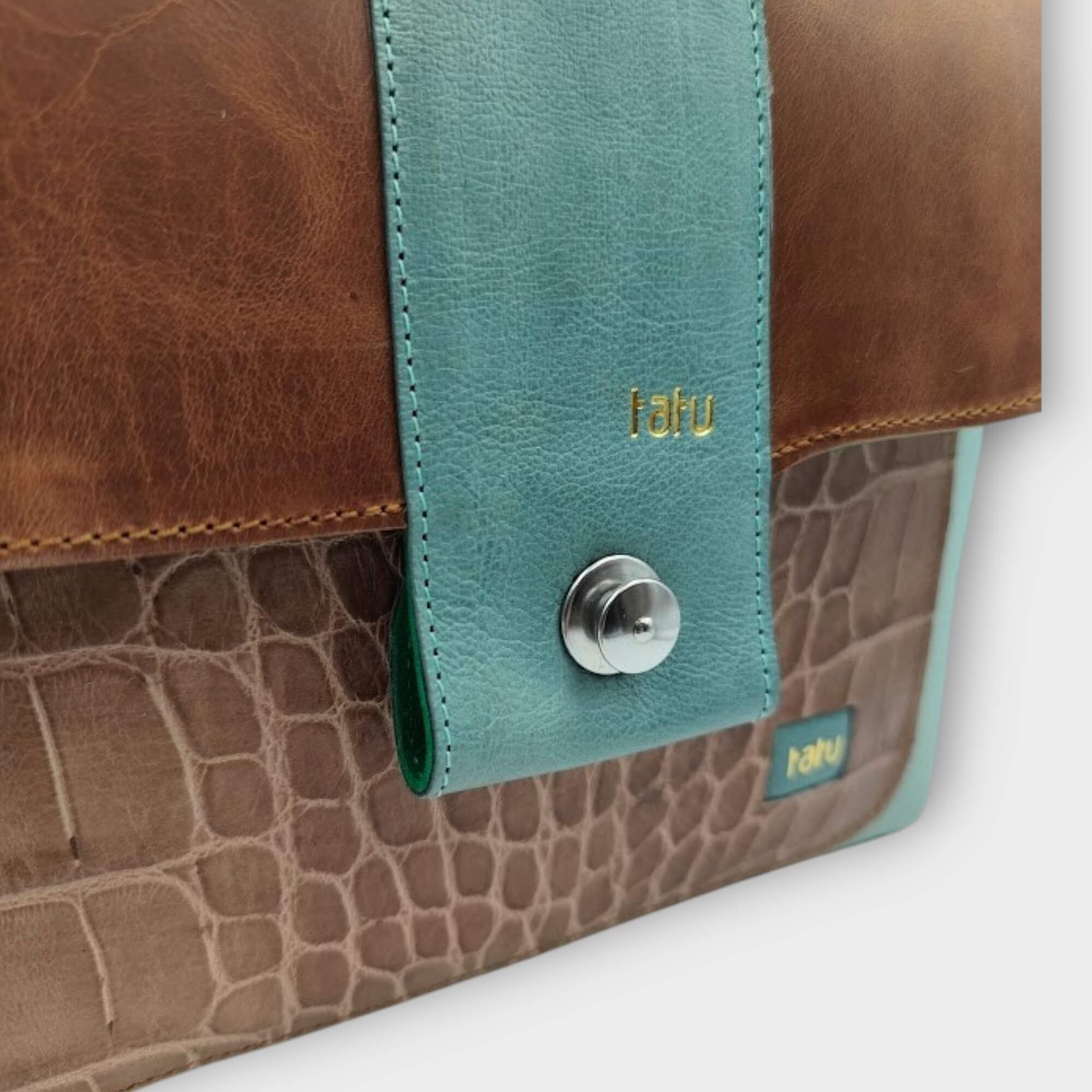 szín: menta, türkiz, barna krokodilnyomatos bőr, barna