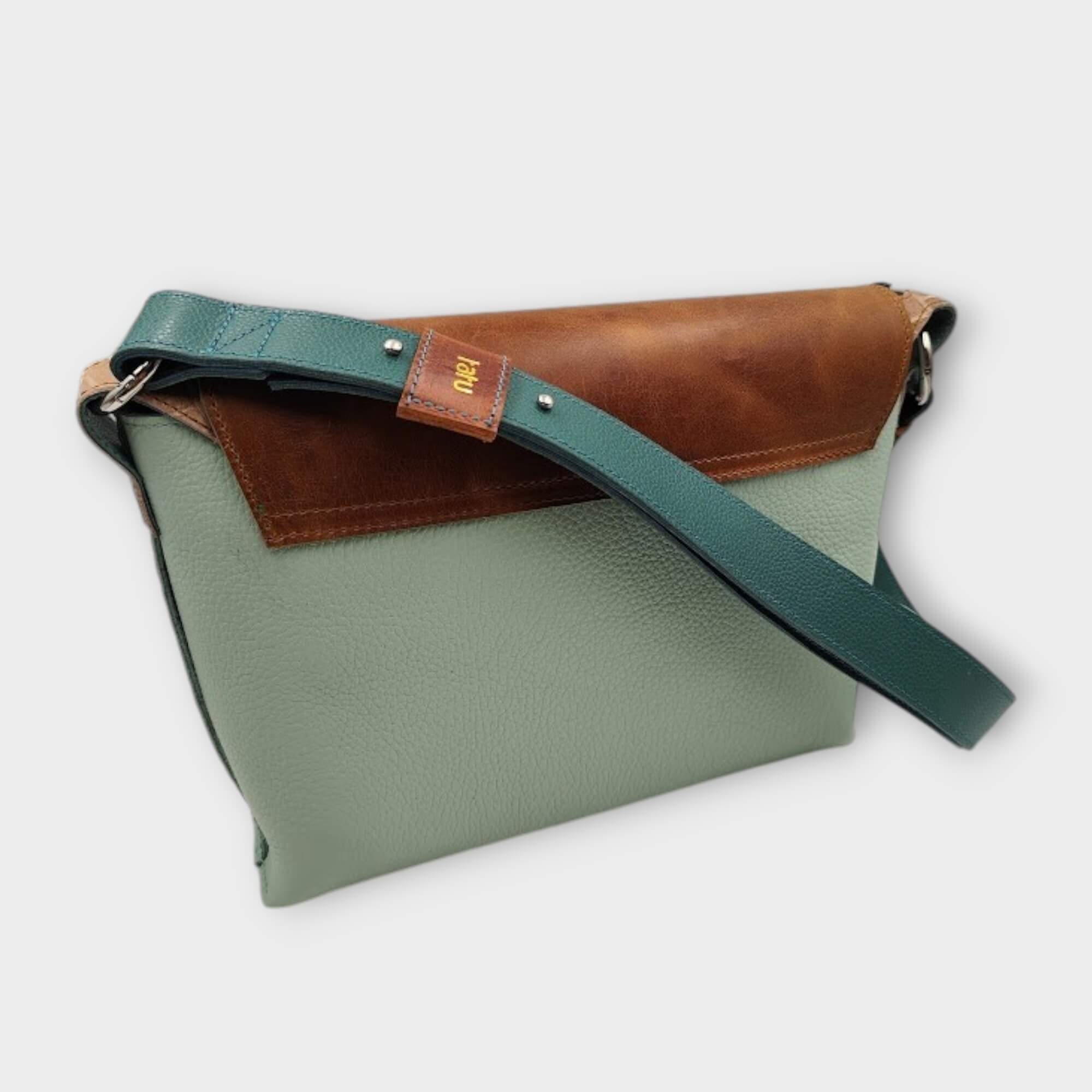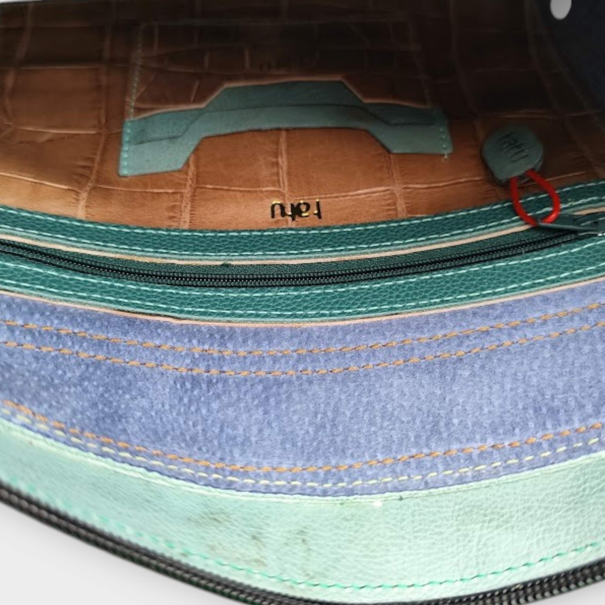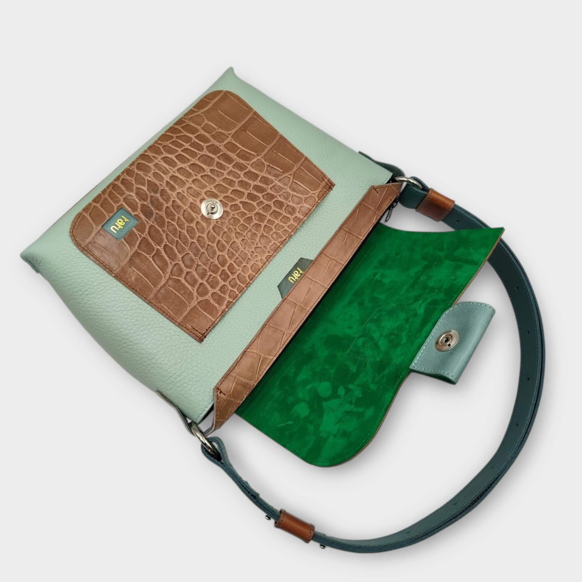 szín: menta, türkiz, barna krokodilnyomatos bőr, barna