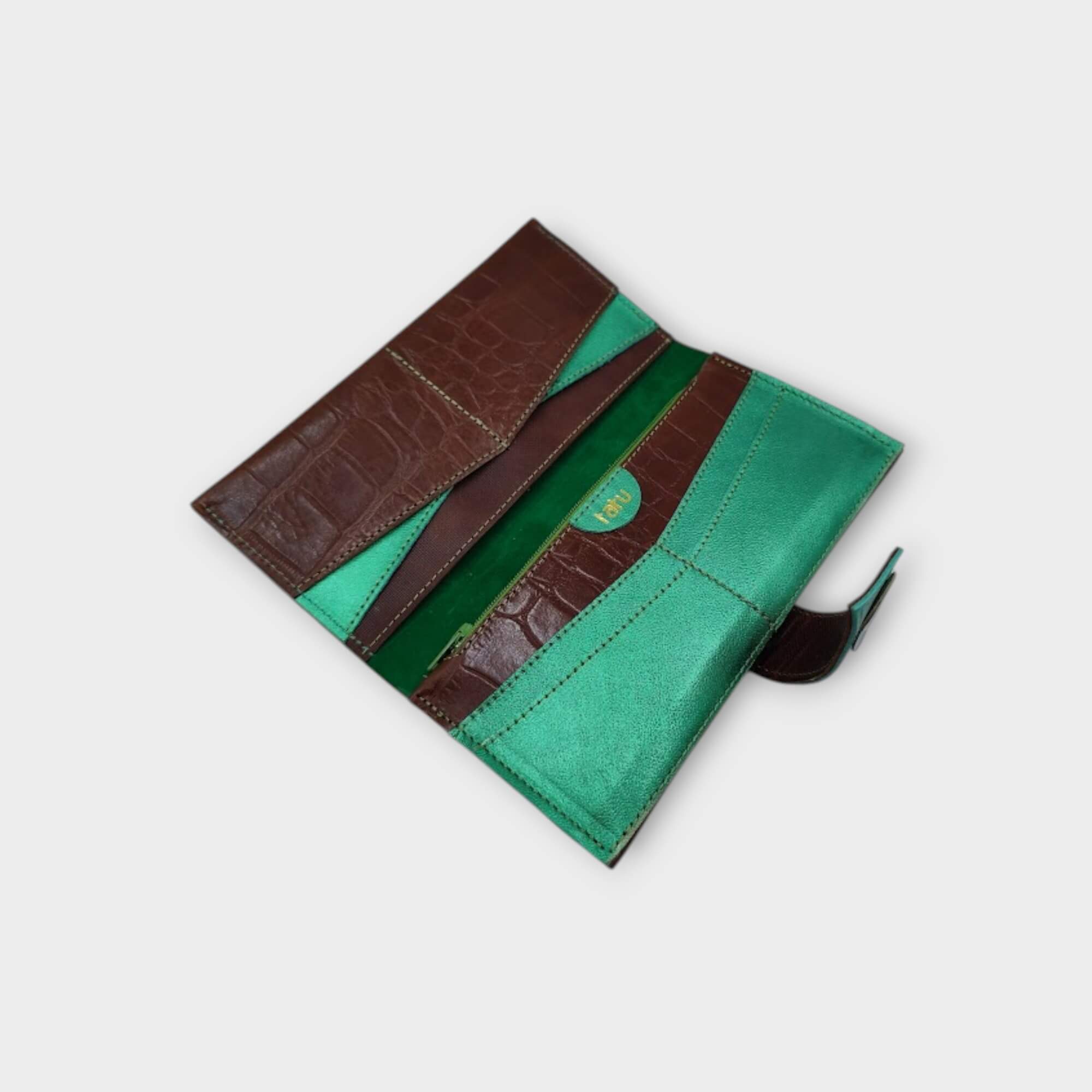 szín: konyak színű krokodil nyomatos marhabőr, metálzöld marhabőr, festett szőrbetét