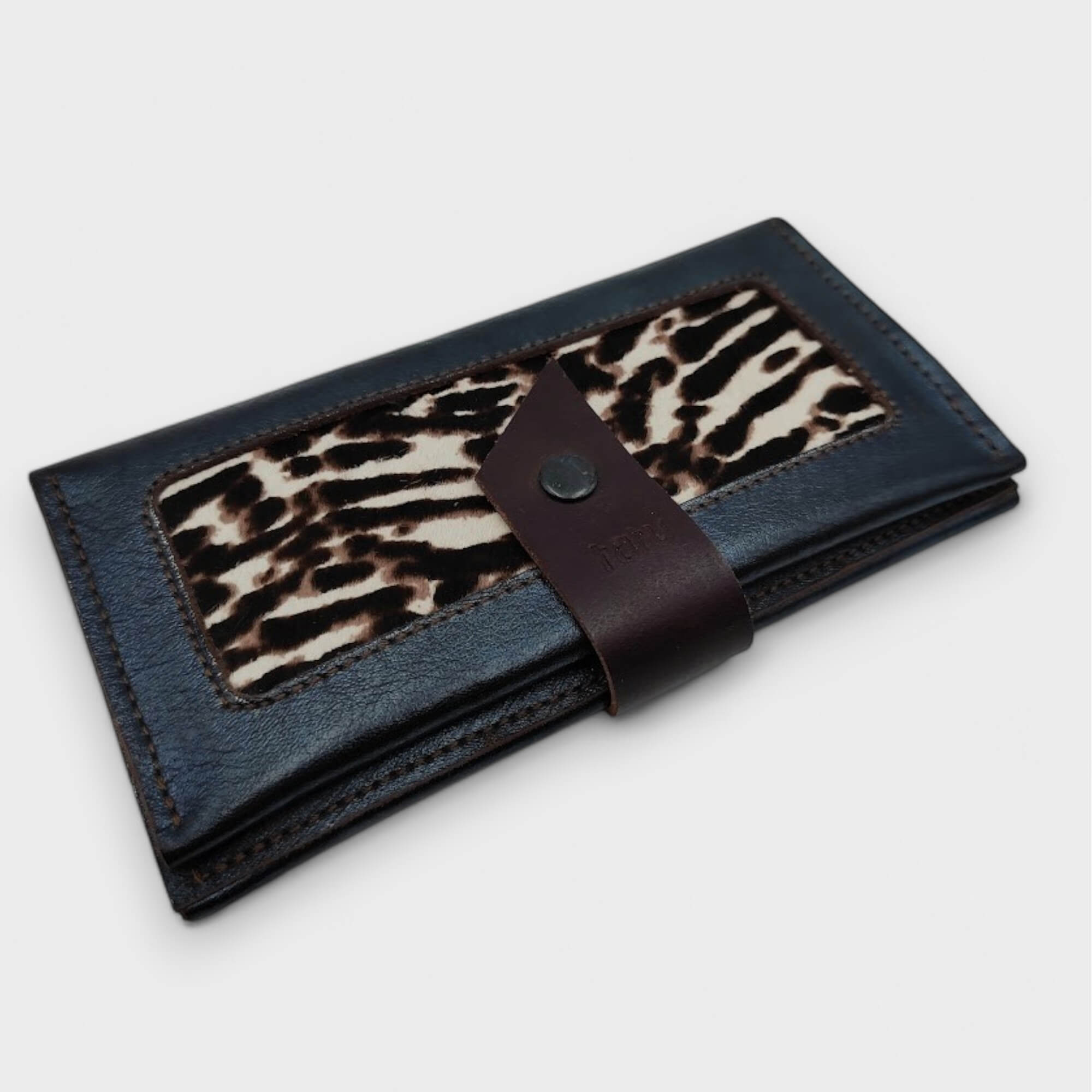 Érdekes csaokibarna színű bőr kékes olajos fénnyel, festett fekete-fehér szőr betét díszítéssel.