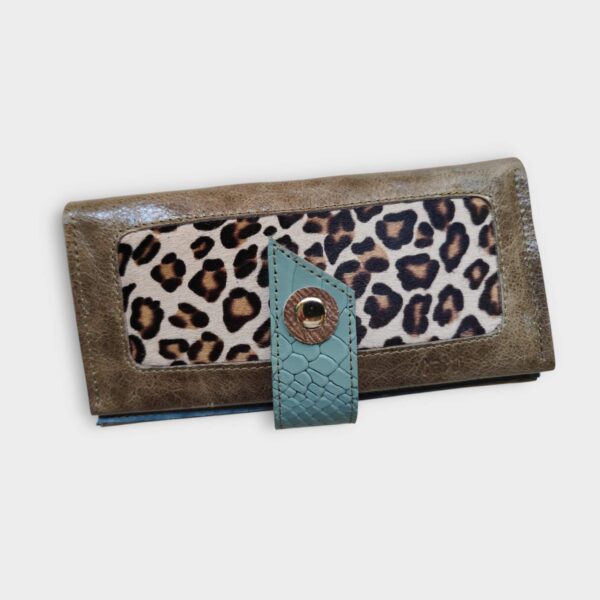 szín: oliva zöld marhabőr, leopárdos festett nyírt szőr, petrol kék