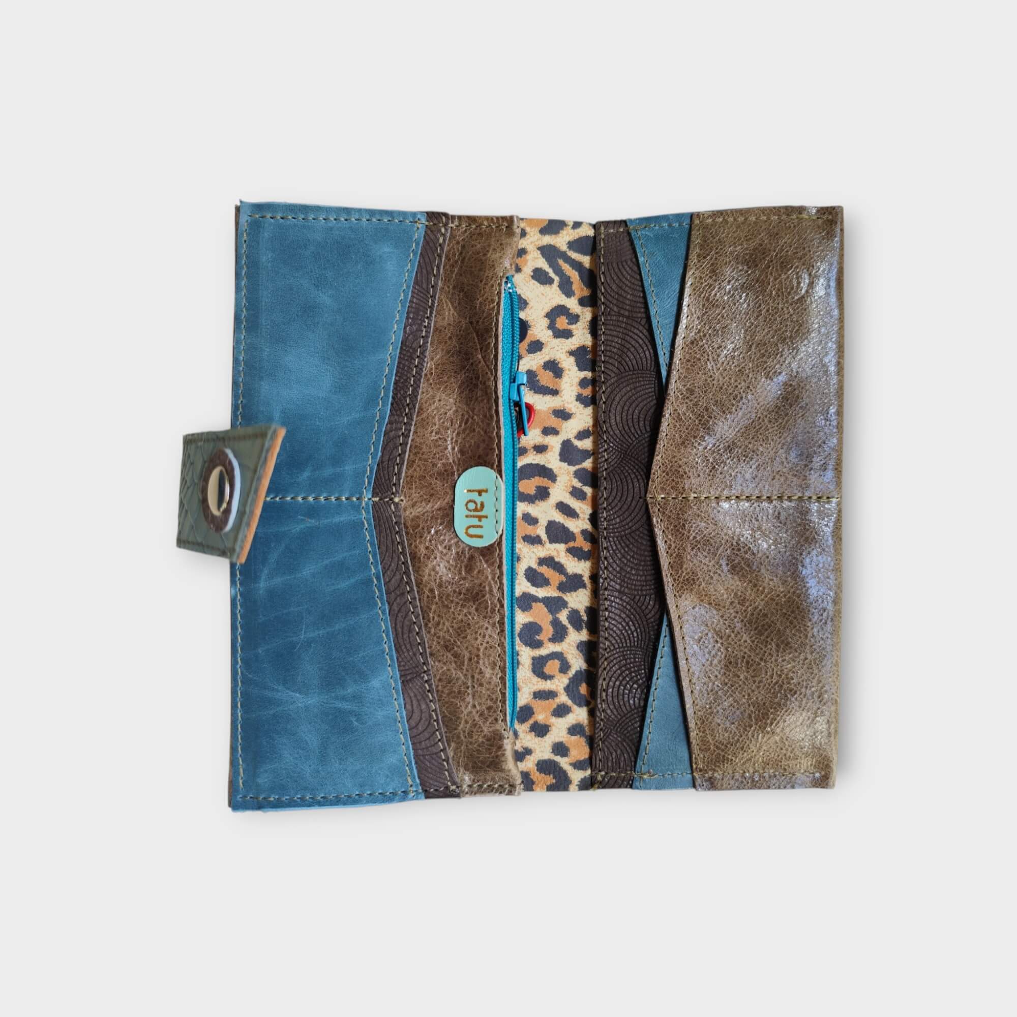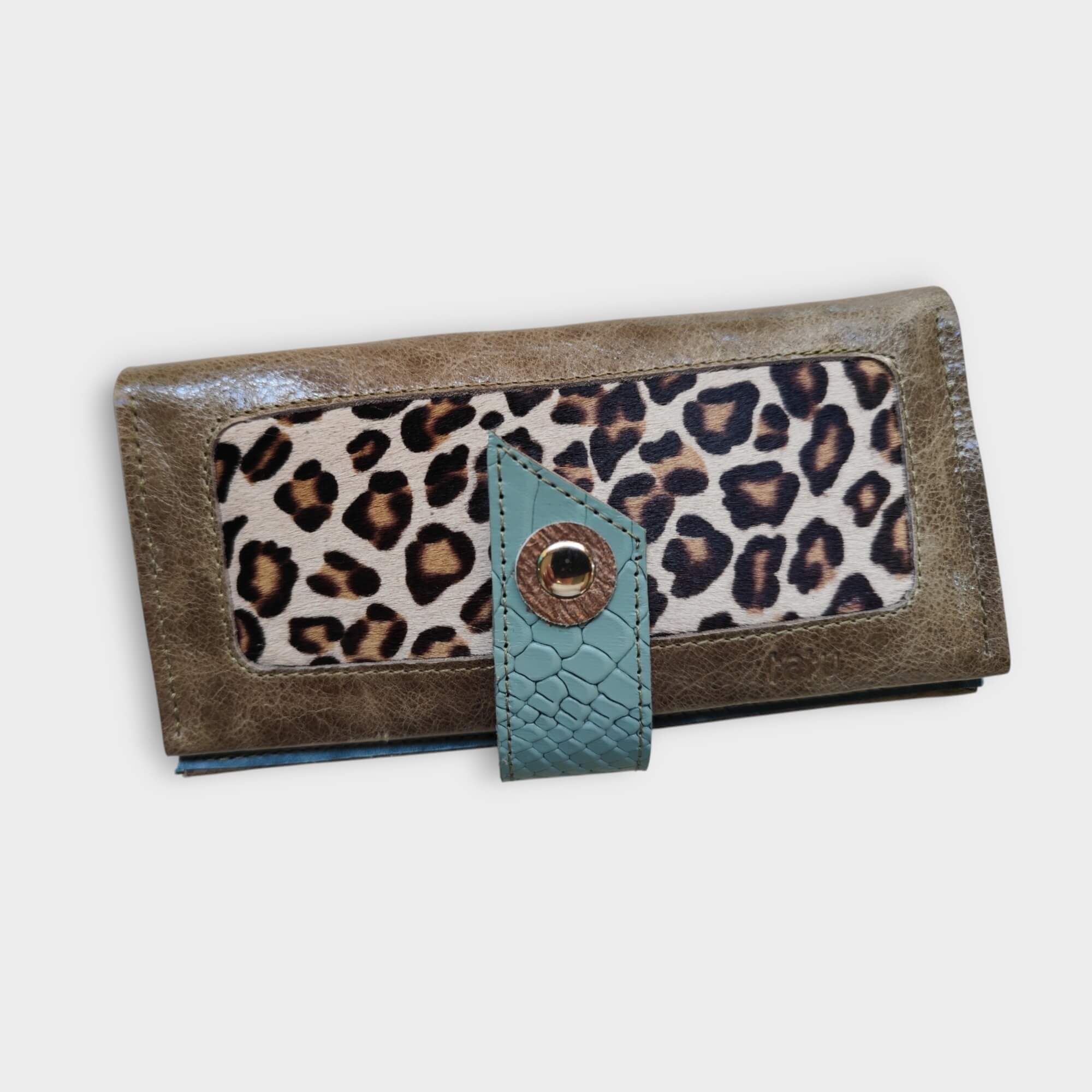 szín: oliva zöld marhabőr, leopárdos festett nyírt szőr,  petrol kék