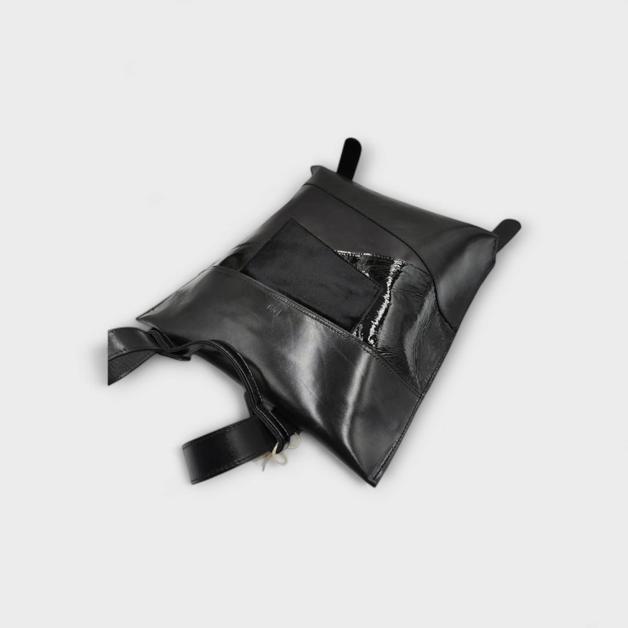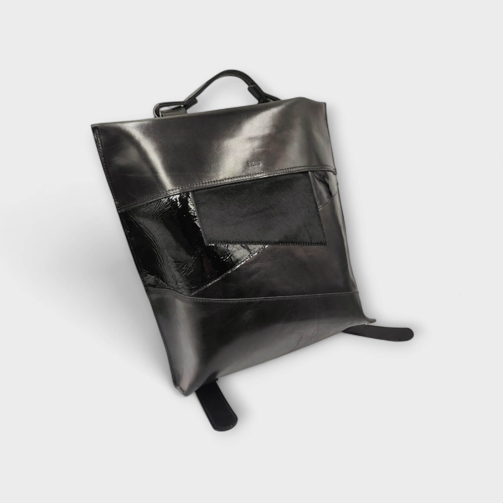 EWE  bőr hátizsák tervezésekor is a több elemből álló ugyanakkor letisztolt formavilágú táskát képzeltem el,  letisztult alakját megtörtem a geometrikus szabással, záródása a hátrészre került elrejtve, márkahű egyéges fekete plasztikus vízálló cipzárral.