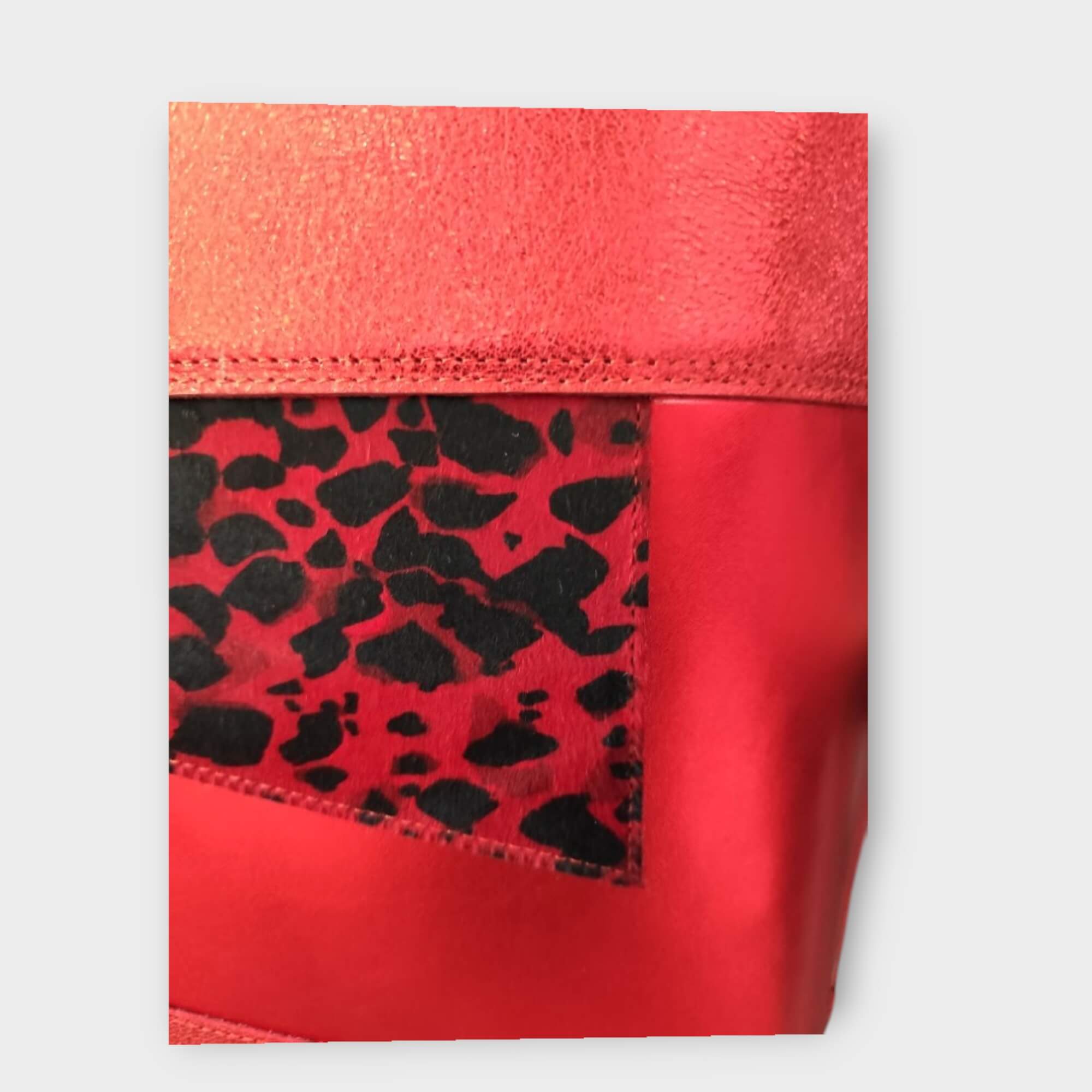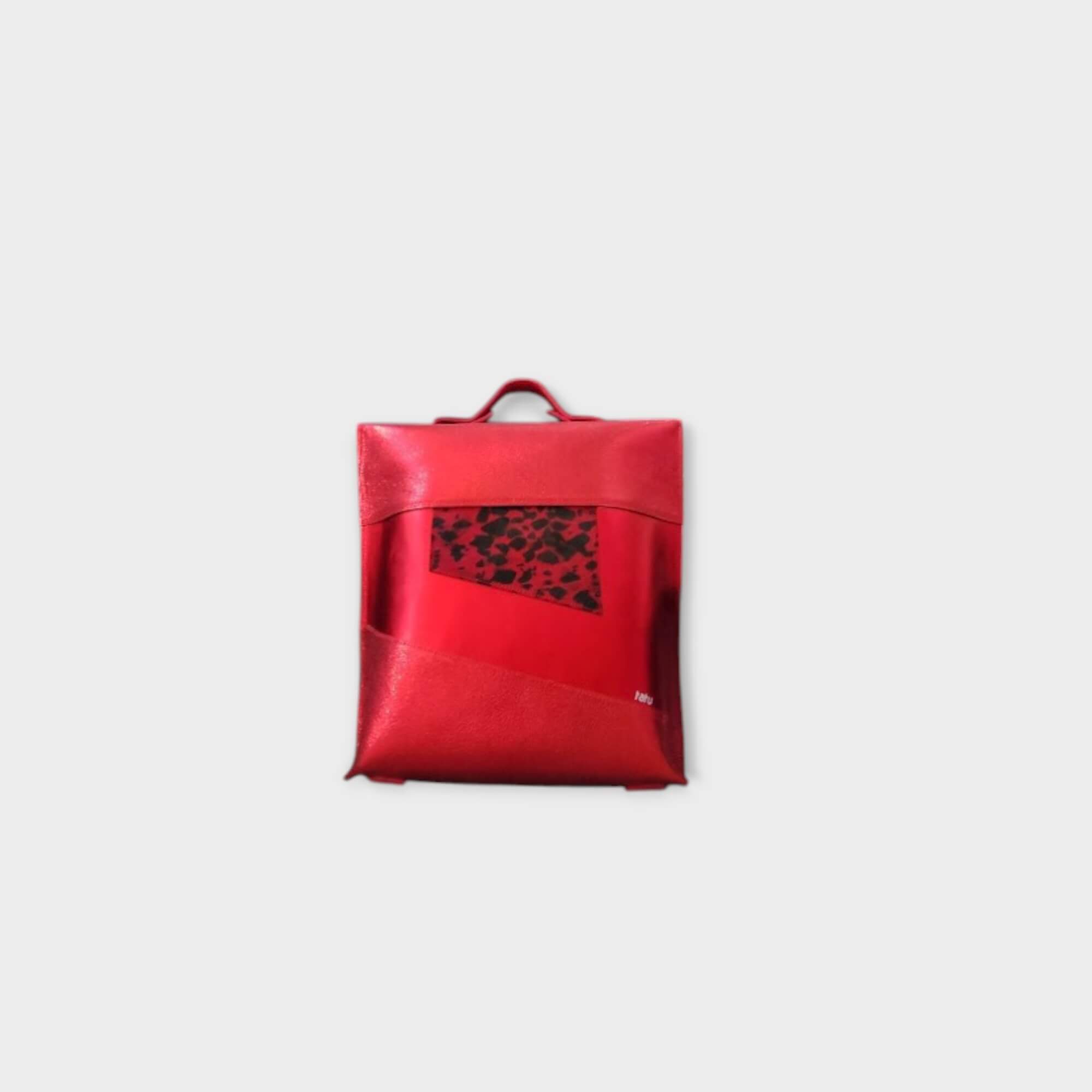 A táska szabásvonala lehetővé teszi, hogy 1 lapból kiszabható letisztult modellként jelenjen meg, ugyanakkor feldobható a több elemes szabás is, mely lehetőséget ad a kisebb maradékok belevarázsolására. Design elemként került a táskára a színben hozzá passzoló piros fekete foltos szőr kiegészítő, így ez a kisebb hulladék is megtalálta hasznos kis helyét.