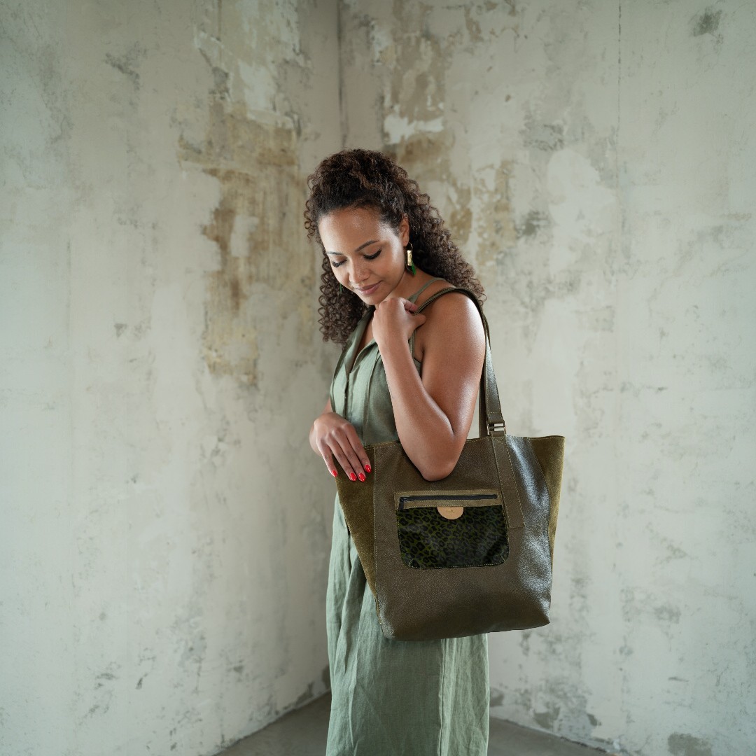 Classic collekció jegyeit viselve az elején aszimmetrikus jellegzetes pánntal. Nagy bőr válltáska, igazán jól pakolható , táska külső profilján 1 db cipzáros zseb. A táska egy rétegű béleletlen puha tapintású lágy marhabőr, elején festett nyírt szőr zsebbel, mely igazán jó karaktert ad a táska megjelenésének,