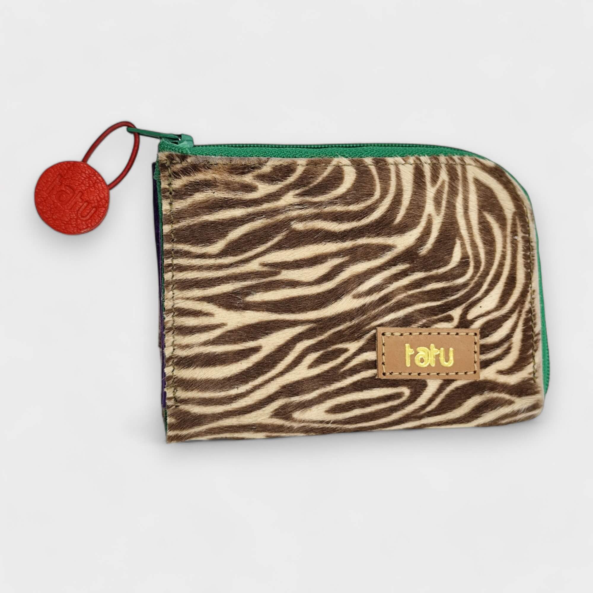 anyag-szín: világosbarna zebra színú festett szőr, töld velúr bélésbőr, zöld aprótartó, zöld cipzár